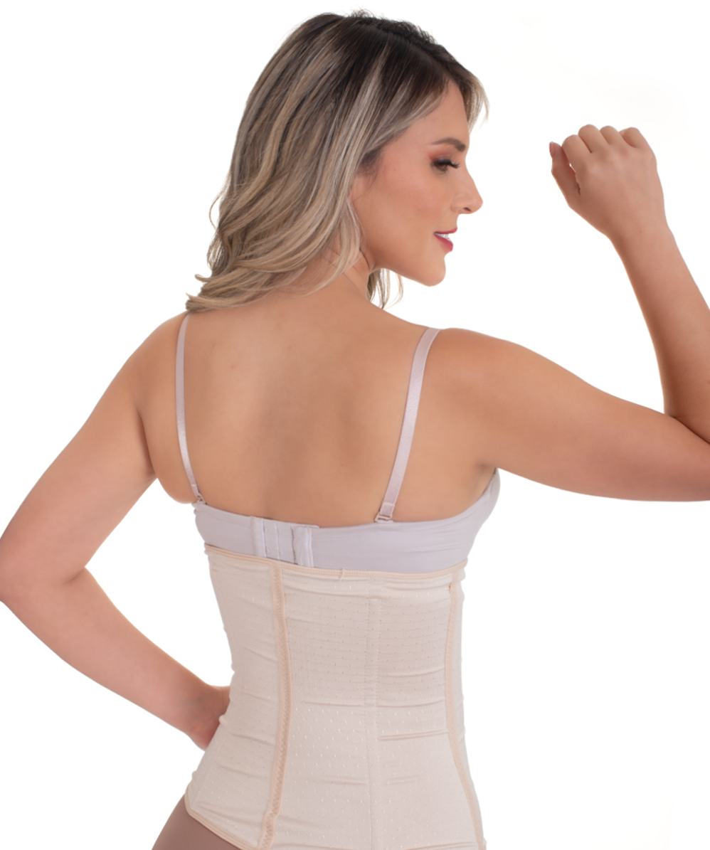 Cinturilla strapless, ganchos en dos posiciones, varillas y latex interno. Waist trainer, hooks with two levels, internal rods and latex