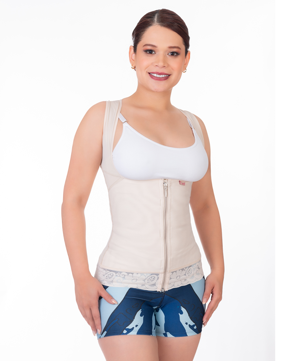 Chaleco senos libres, cierre frontal, tira ancha, encaje siliconado en abdomen, corrector de postura. Vest, free bust, front zipper, wide strip, silicone in abdomen, posture corrector