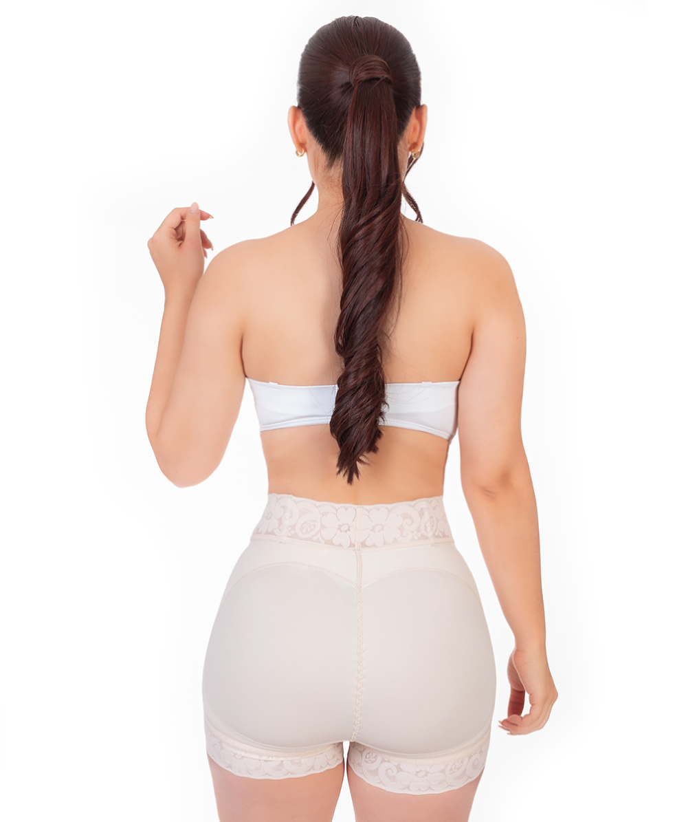 Short corto, siliconado en cintura y piernas, realce de glúteos, refuerzo al abdomen. Short leg, silicone lace in waist and legs, butt lift, reinforcement in abdomen